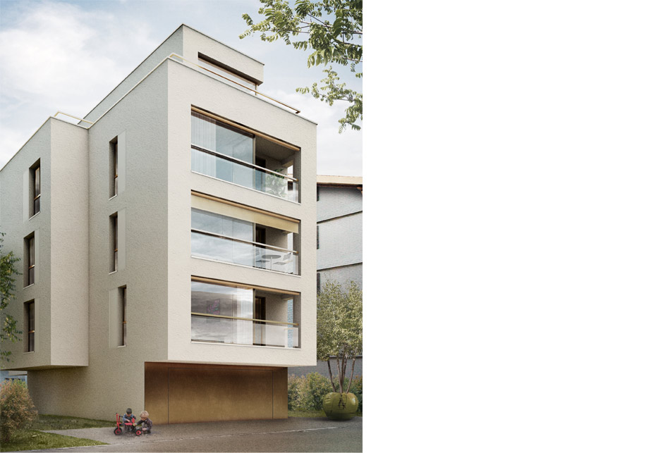 Der Standort des Wohnhauses besticht sowohl durch die zentrale Lage im Dorfkern, als auch durch die ruhige Ausstrahlung, den der naheliegende Dorfbach Lorze durch sein leises Rauschen schafft. Die relativ schmale, aber lange Parzelle mit Nord-Süd Ausrichtung ist, wie für historische Ortskerne typisch, dicht in die umliegende Gebäudestruktur eingebettet. Die Form des neuen Wohnhauses greift entsprechend der Grundstücksform die Längsrichtung auf und verstärkt diese mit zusätzlichen Auskragungen gegen Norden und Süden. Zudem konnte bei der Gestaltung ein besonderer Nutzen aus der baurechtlich möglichen Viergeschossigkeit gezogen werden. So war es möglich einen schmalen, vertikal eleganten Baukörper zu gestalten, dessen Fassade auf dynamische Art und Weise die Struktur der Strassenflucht ergänzt. Ein besonders rauer Strukturputz mir teilweise eingebetteter Ornamentik trägt der historischen Handwerkskunst Rechnung. Um trotz der dichten Siedlungsstruktur die Privatsphäre zu gewährleisten, bleibt die Fassade gegenüber den Nachbargrundstücken eher geschlossen. Als Kontrast dazu öffnet sich das Gebäude gegen den südlich liegenden Garten und den im Norden liegenden Bach mit grossen Glasflächen und überdachten Loggias.